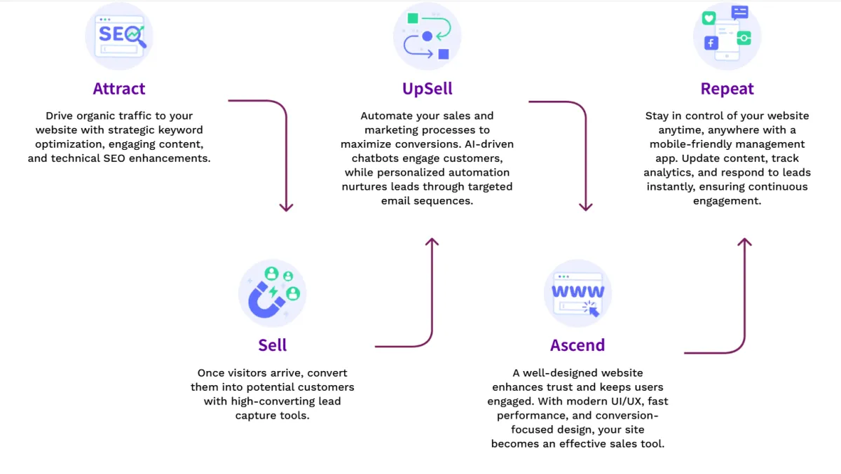 Maximize your online potential with our expert SEO, lead-nurturing automation, AI-driven insights, and stunning website designs. Plus, stay in control on the go with our mobile app for seamless management of website leads and clients.